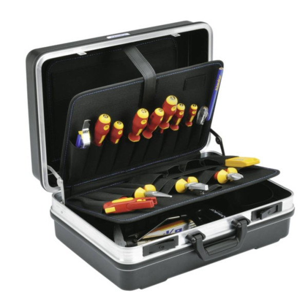 Pevný kufor, čierny, obsahuje základné vybavenie pre každého elektrikára.
